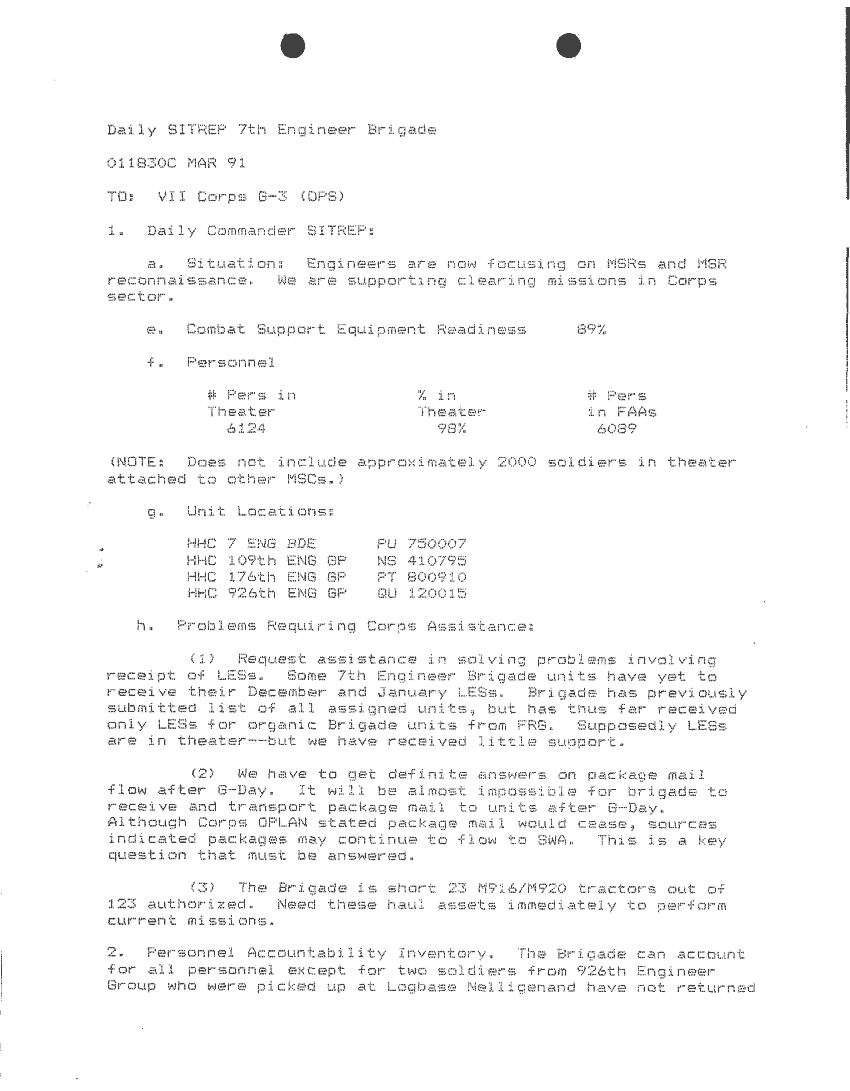 Document 87 f:/Week-24/BX000213/SITUATION REPORTS 7TH ENG BDE 22 DEC 90- 10 APR 91/daily commander sitrep:10019616504540