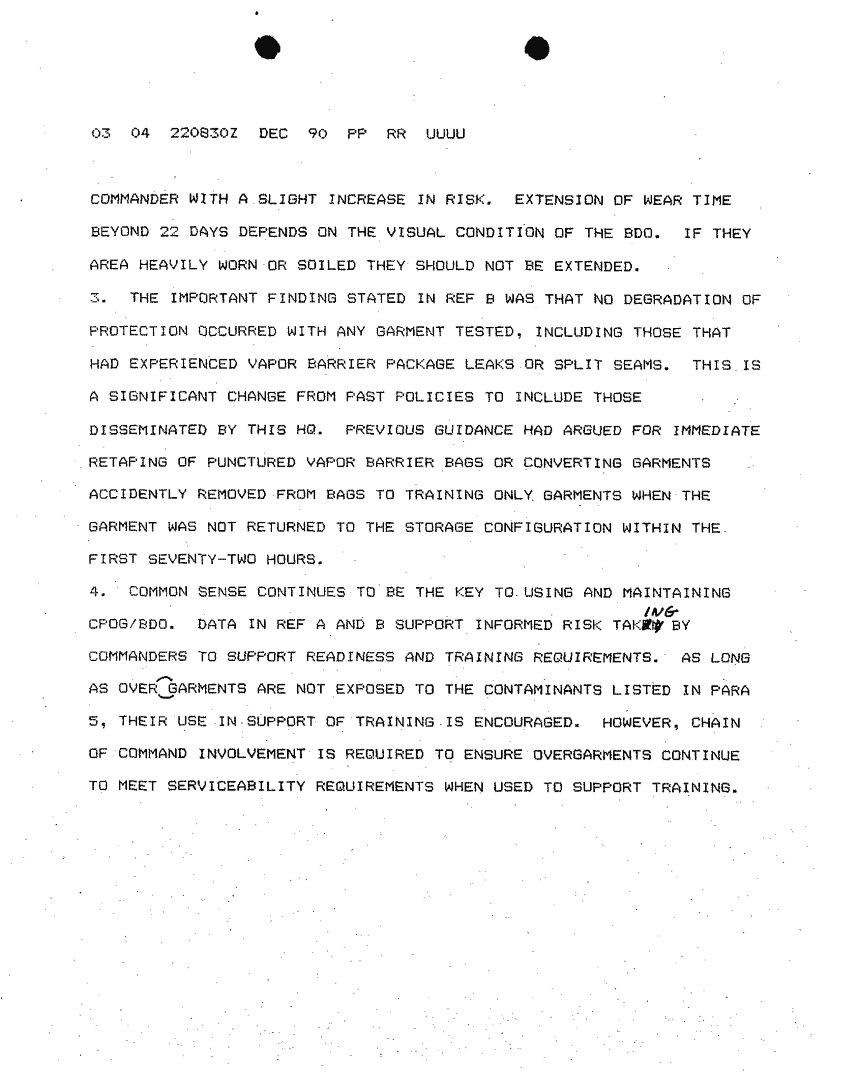 Document 4 f:/Week-22/BX001506/DUTY LOG DEC 90/chemical protective overgarments 22 dec 90:1001961650309