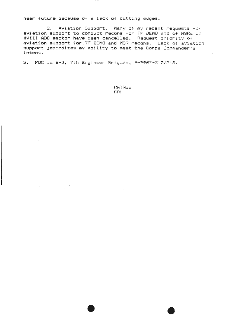 Document 87 f:/Week-24/BX000213/SITUATION REPORTS 7TH ENG BDE 22 DEC 90- 10 APR 91/daily commander sitrep:10259613090426