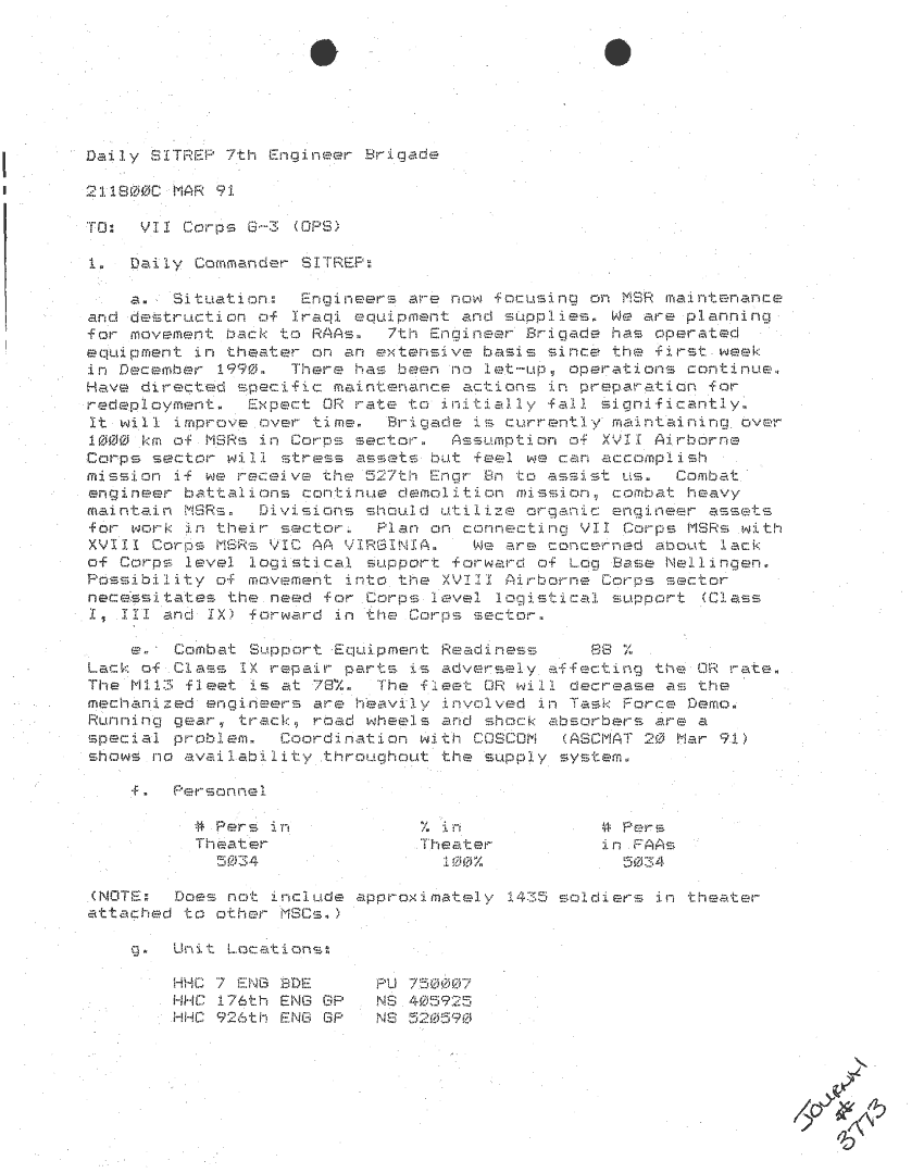 Document 87 f:/Week-24/BX000213/SITUATION REPORTS 7TH ENG BDE 22 DEC 90- 10 APR 91/daily commander sitrep:10259613090426