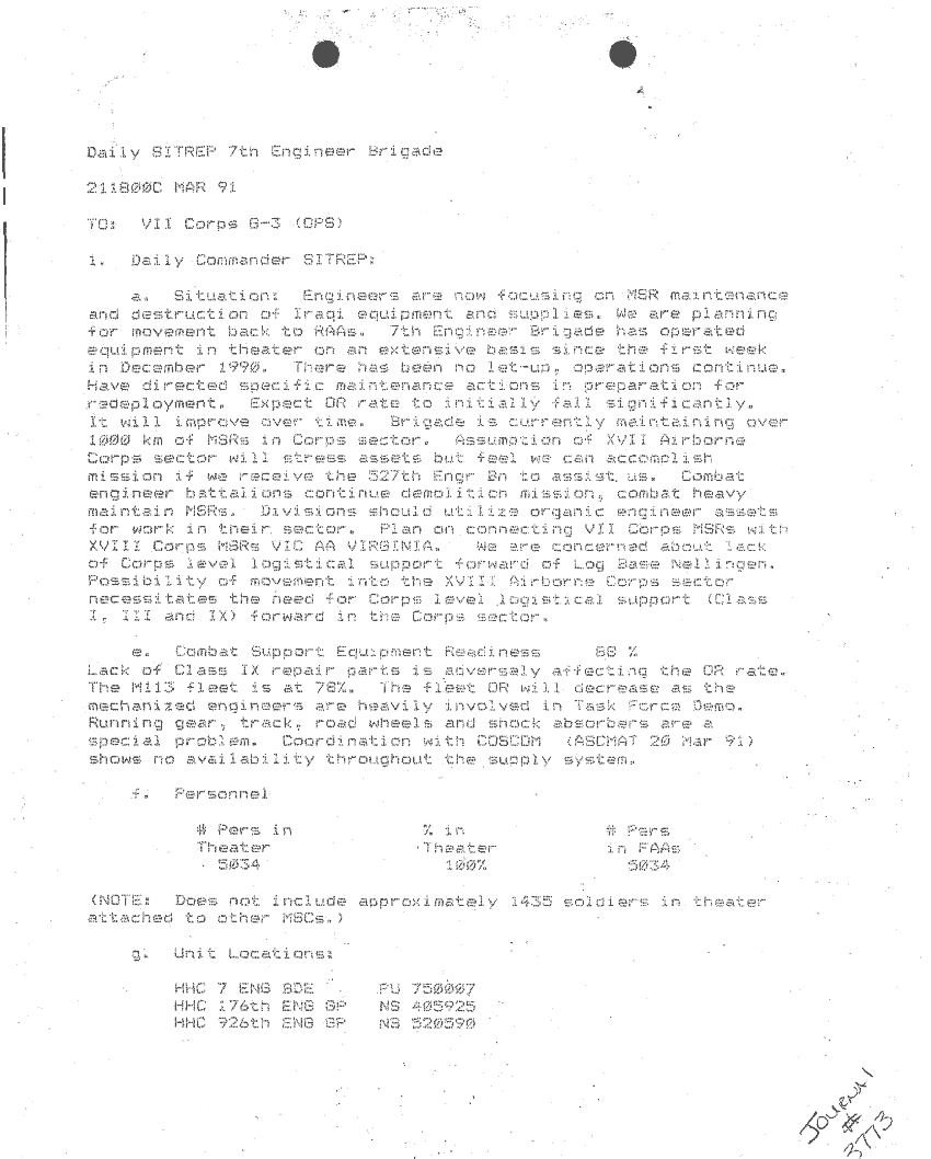 Document 87 f:/Week-24/BX000213/SITUATION REPORTS 7TH ENG BDE 22 DEC 90- 10 APR 91/daily commander sitrep:10259613090426