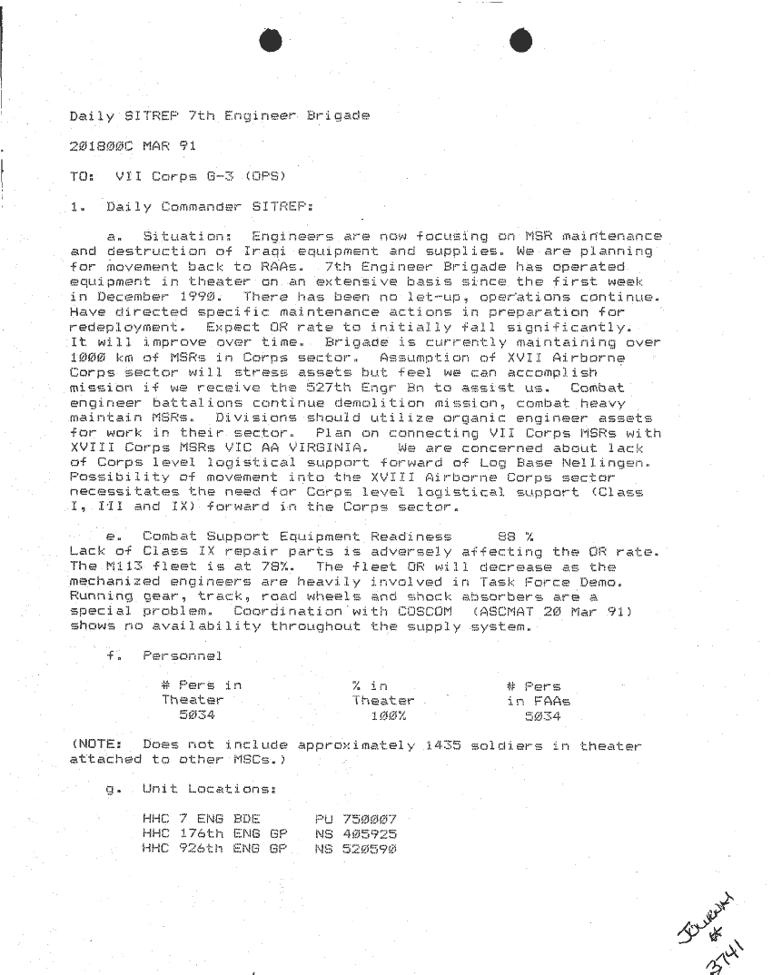 Document 87 f:/Week-24/BX000213/SITUATION REPORTS 7TH ENG BDE 22 DEC 90- 10 APR 91/daily commander sitrep:10259613090426