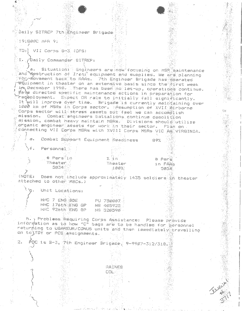 Document 87 f:/Week-24/BX000213/SITUATION REPORTS 7TH ENG BDE 22 DEC 90- 10 APR 91/daily commander sitrep:10259613090426