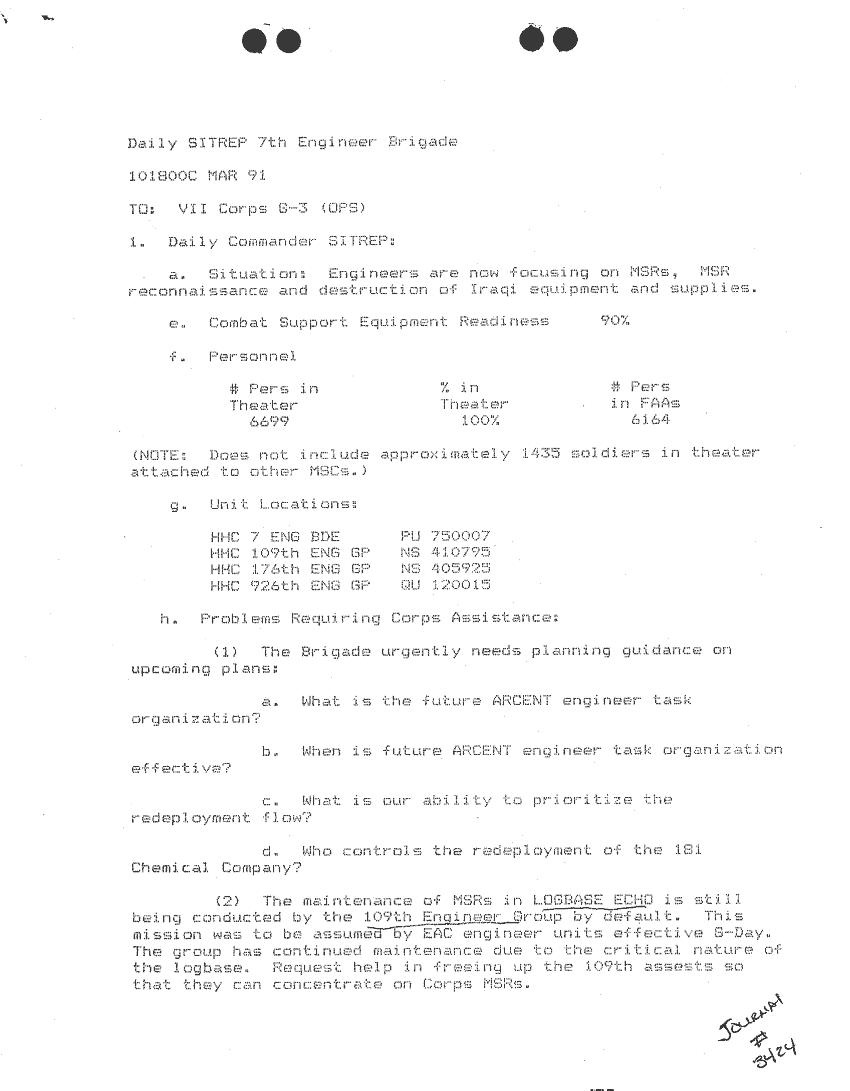 Document 87 f:/Week-24/BX000213/SITUATION REPORTS 7TH ENG BDE 22 DEC 90- 10 APR 91/daily commander sitrep:10259613090426