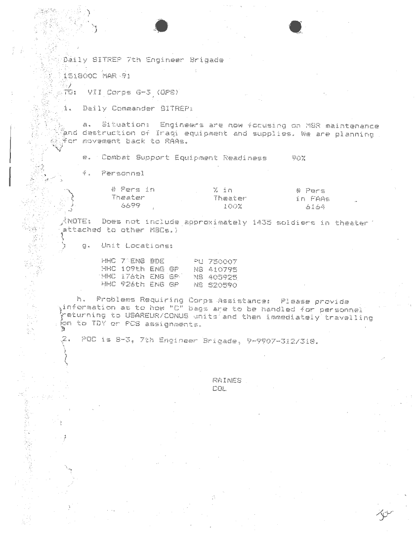 Document 87 f:/Week-24/BX000213/SITUATION REPORTS 7TH ENG BDE 22 DEC 90- 10 APR 91/daily commander sitrep:10259613090426