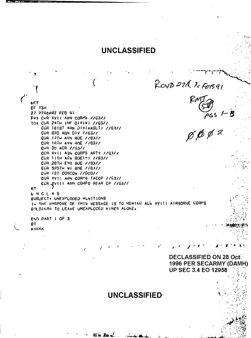 Document 3 f:/Week-10/BX000020/DUTY LOG G3 REAR INCOMING MESSAGES 20 FEB - 14 MAR 91/unexploded munitions:11049609131546