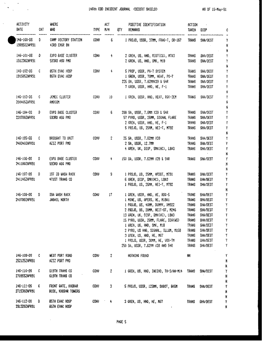 Document 27 f:/Week-42/BX005554/ARMY EOD IN DESERT STORM VOL 5 512 EOD CONTROL TEAM EODCT/reply to questionaire for all detachments:11049609124410