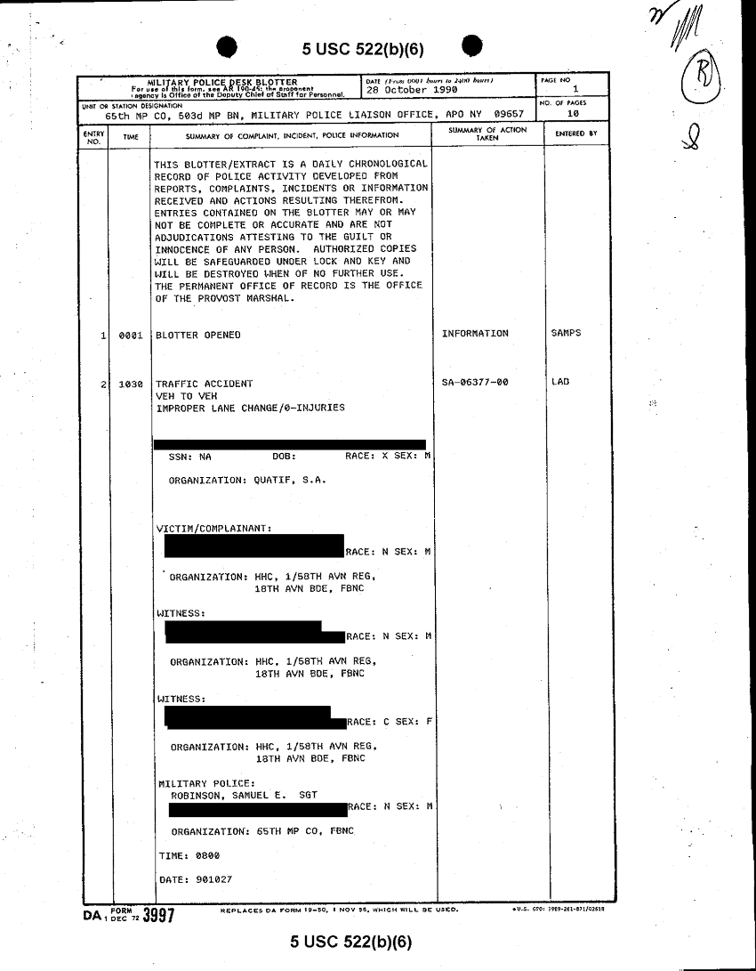 Document 12 f:/Week-18/BX000061/DA FORM 3997 MILITARY POLICE DESK BLOTTER-SEP-NOV 90/military police desk blotter 28 oct 90:11089615150340