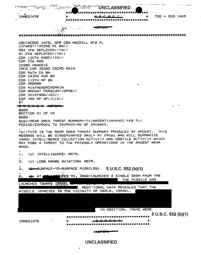 Document 16 f:/Week-32/BX000502/TACTICAL OPERATIONS CENTER LOGS-INCOMING MESSAGE FILES- 24 TO 26 FEB 91/arcent rear area threat summary:11089615160275