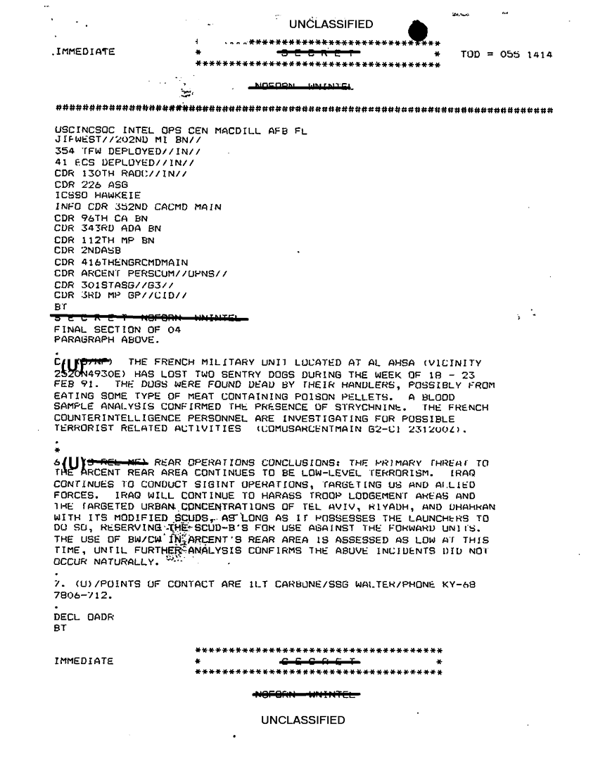 Document 16 f:/Week-32/BX000502/TACTICAL OPERATIONS CENTER LOGS-INCOMING MESSAGE FILES- 24 TO 26 FEB 91/arcent rear area threat summary:11089615160275