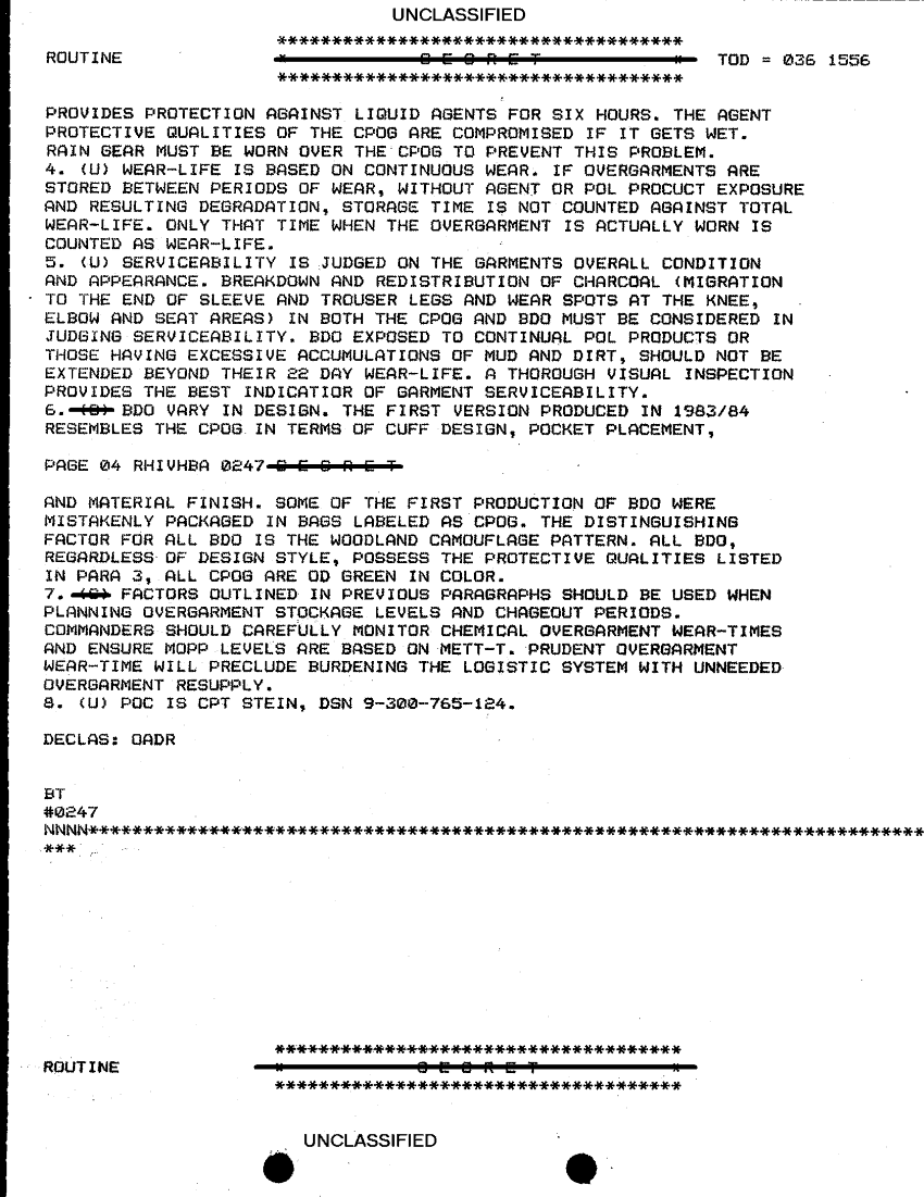 Document 2 f:/Week-28/BX000406/TOC LOGS - INCOMING LOGS FOR 6-8 FEB 91/chemical overgarment wear life and serviceabilit:11089615154464