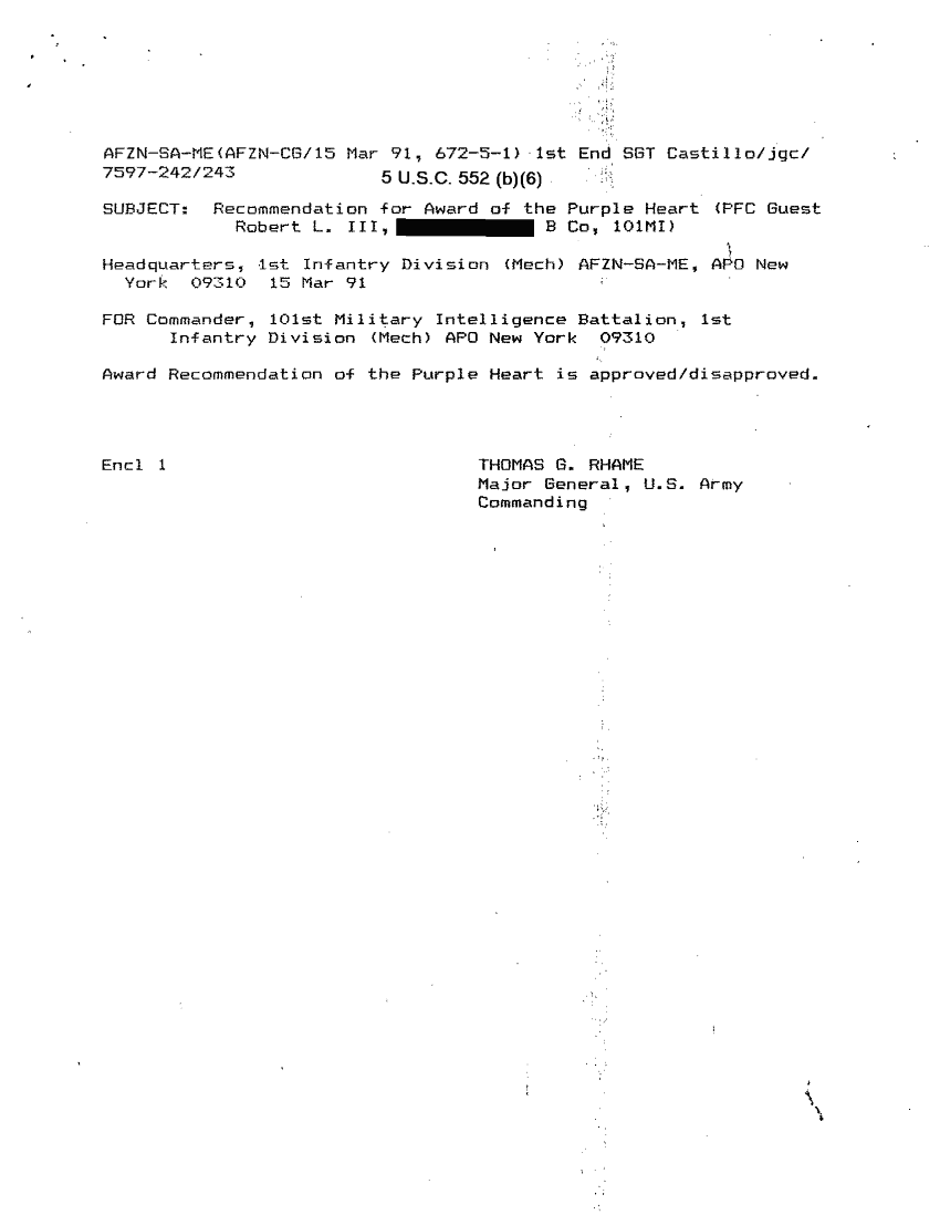 Document 78 f:/Week-26/BX001004/AWARD GUEST ROBERT L III-1/casualty report award of the purple heart:12179611151925
