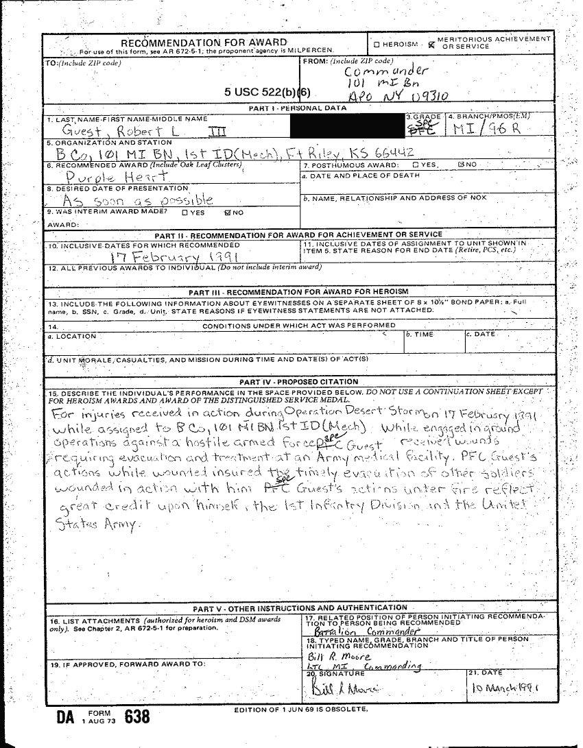 Document 78 f:/Week-26/BX001004/AWARD GUEST ROBERT L III-1/casualty report award of the purple heart:12179611151925
