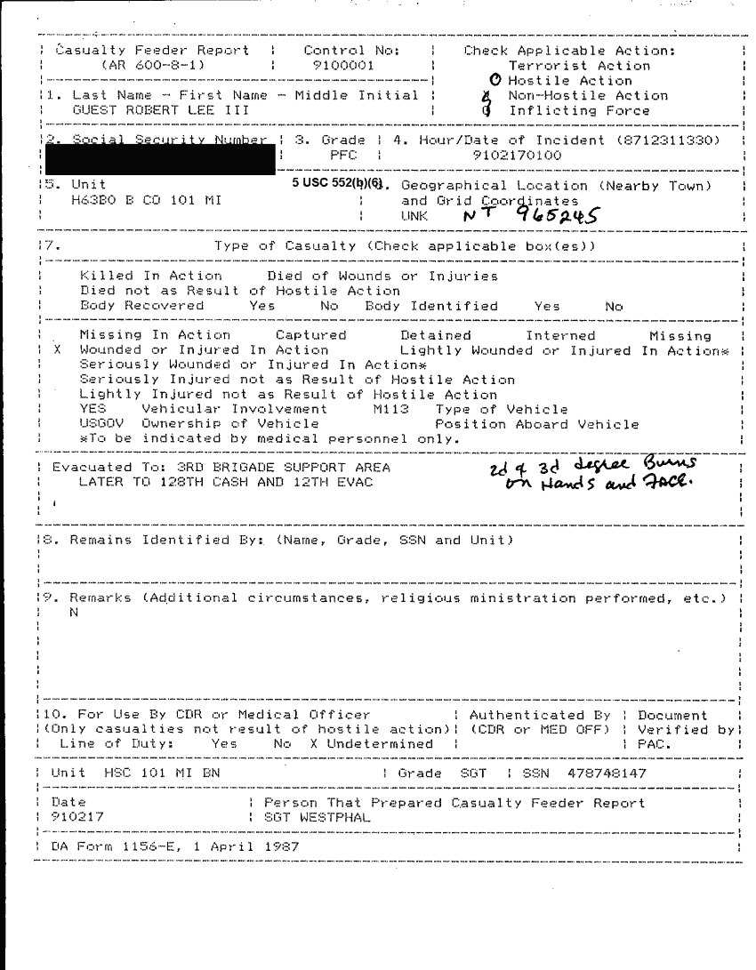Document 78 f:/Week-26/BX001004/AWARD GUEST ROBERT L III-1/casualty report award of the purple heart:12179611151925
