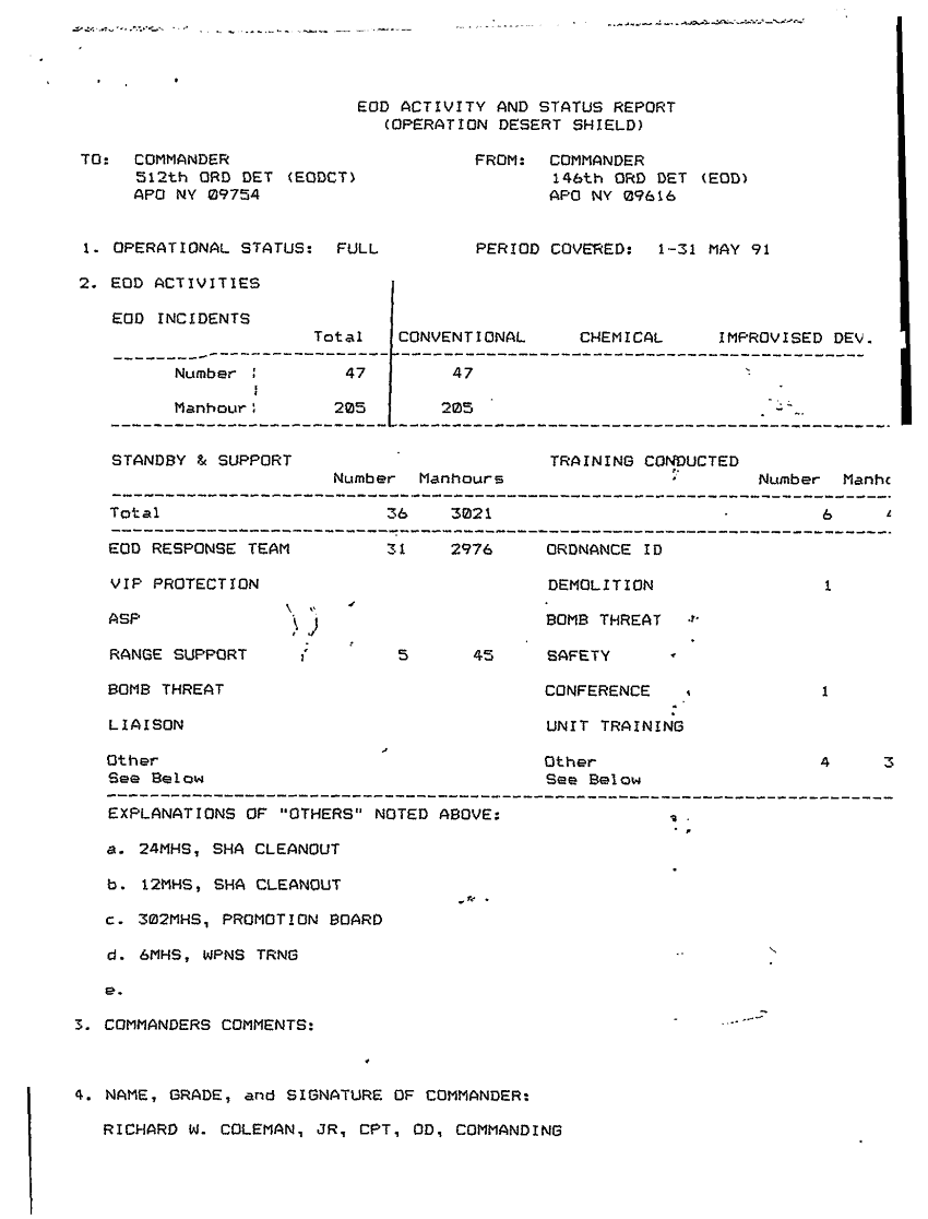 Document 5 f:/Week-46/BX005555/512TH EODCT SUBORD UNIT JOURNALS EOD INCIDENTS/eod activity and status report ods 1 31 may 91:121796111630102