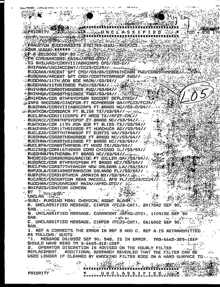 Document 2 f:/Week-29/BX000401/TACTICAL OPERATIONS CENTER LOGS - MSG FILE LOGS 30 SEP 90/purging m8a1 chemical agent alarm:12269616083315