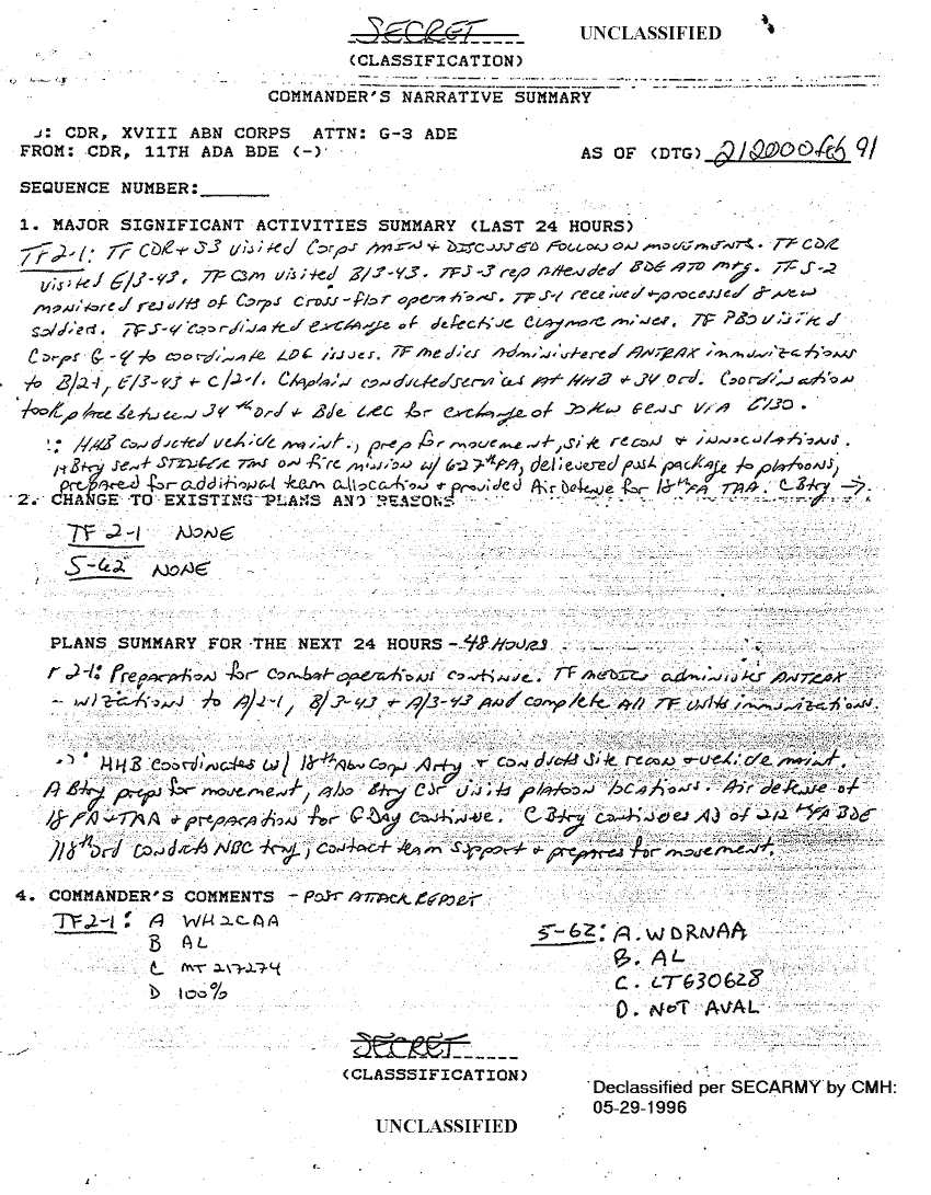 Document 36 f:/Week-18/BX000056/TASK FORCE 2-1 ADA SITREPS FEB 91/situation reports 11th ada bde feb 91:010297184310118