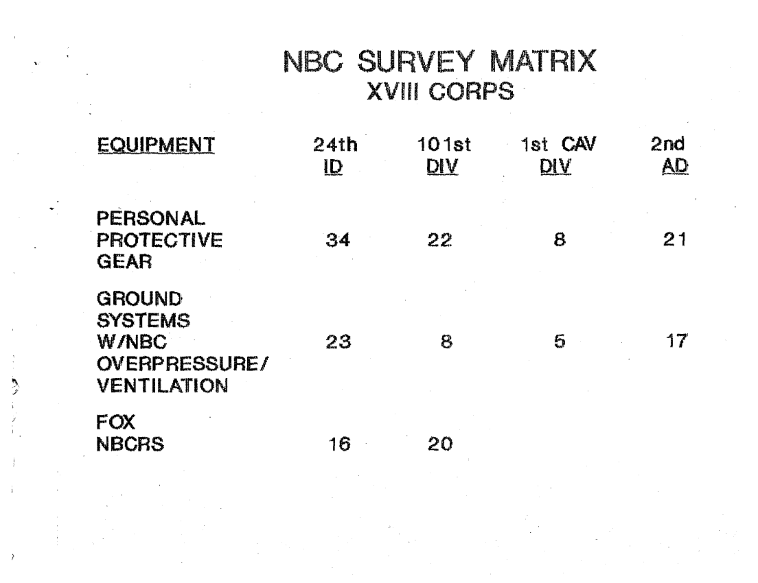 Document 9 f:/Week-14/BX000012/G3 SPECIAL SUBJECT FILES WPNS SYST CBT PERFORM ASSESS TM/nbc survey matrix xviii corps:0103970806292