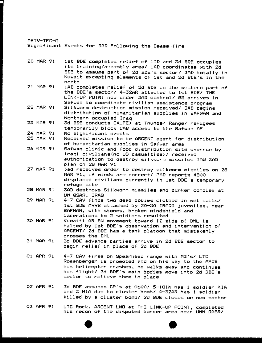 Document 3 f:/Week-48/BX000531/LOD AND REPORT 4-5 APR 91/significant events for 3ad following the cease fire:01289718515611