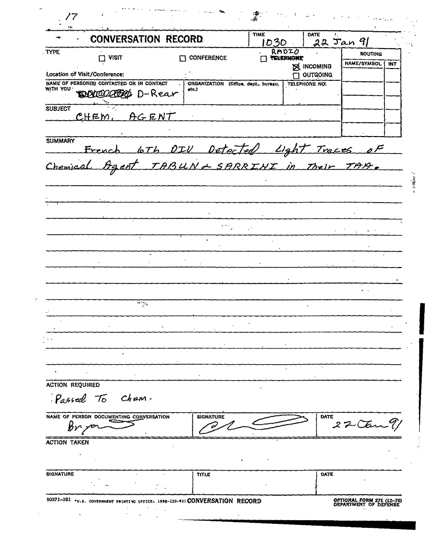 Document 1 f:/Week-48/BX001610/DS-S G3 OPS D MAIN DUTY LOG/intel spt rpt 23 jan 91 chem agent:03069709502745