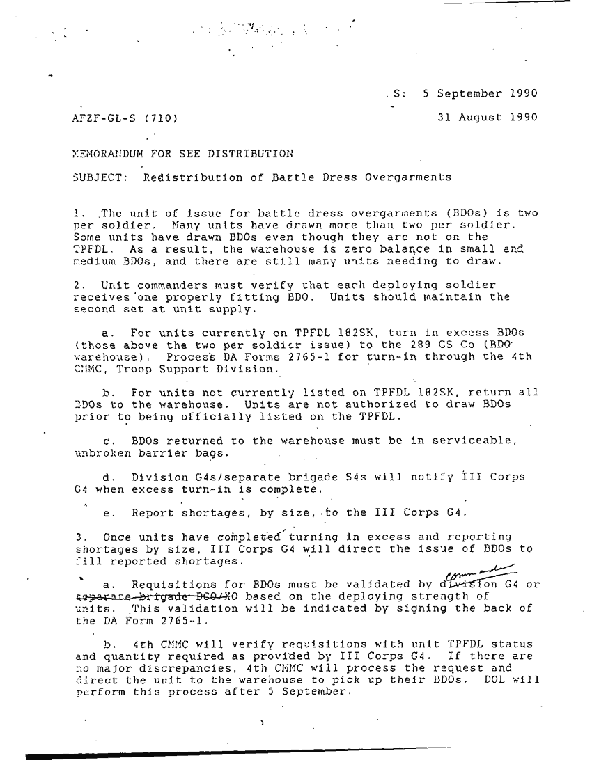Subject = REDISTRIBUTION OF BATTLE DRESS OVERGARMENTS 1 SEP 90