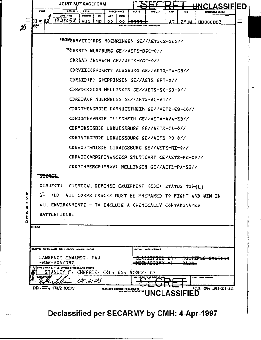 Subject = CHEMICAL DEFENSE EQUIPMENT STATUS