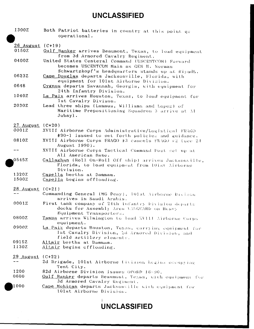 Subject = XVIII AIRBORNE CORPS OPERATION DESERT SHIELD CHRONOLOGY