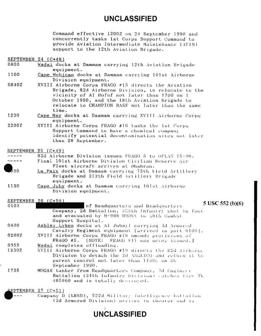 Subject = XVIII AIRBORNE CORPS OPERATION DESERT SHIELD CHRONOLOGY