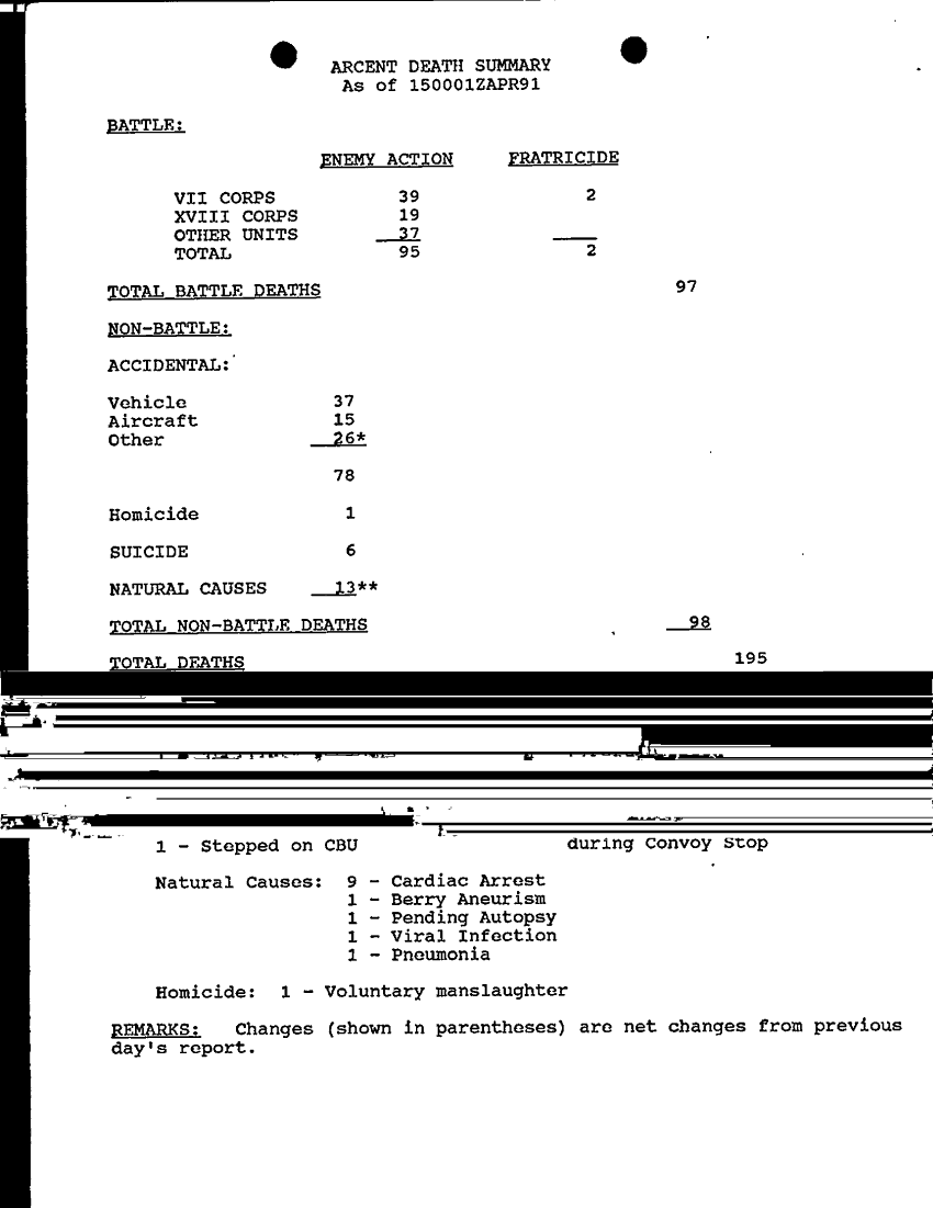 Subject = ARCENT DEATH SUMMARY AS OF 15 APR 91