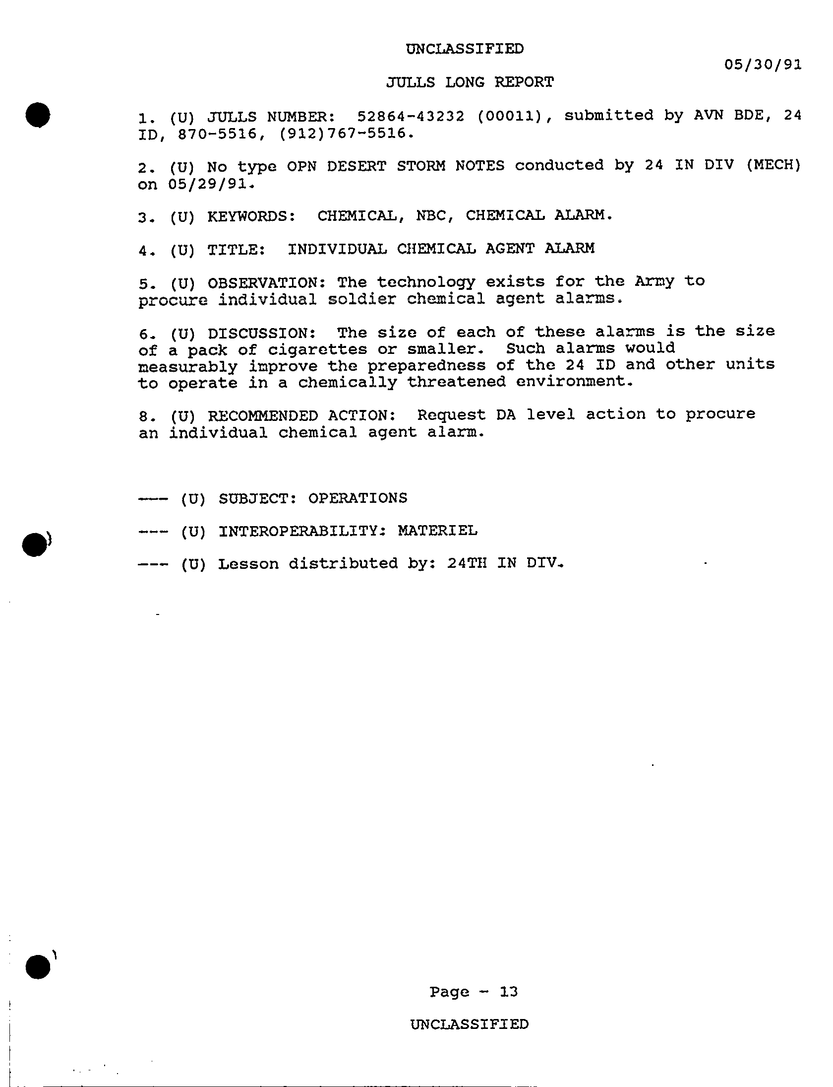 Subject = JULLS LONG REPORT 30 MAY 91