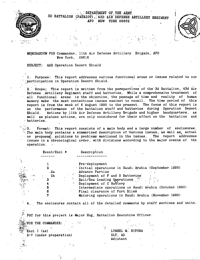 Subject = 3RD BN PATRIOT 43RD ADA RGMT AAR OPN DES SHIELD