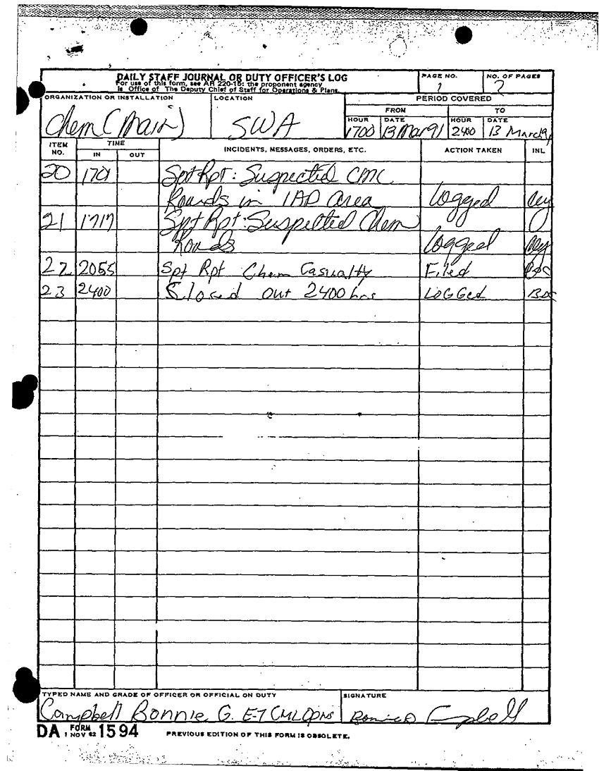 Document 19 f:/Week-25/BX000231/0007 CORPS CHEMICAL BOOK THREE-FOLDER 2 OF 2/daily staff journal or duty officers log 13 mar 91:0922971201259
