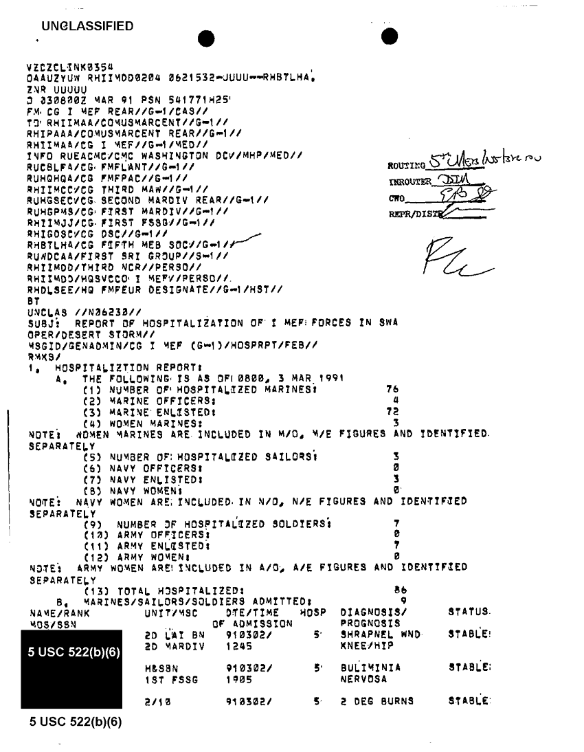 Document 8 f:/Week-39/BX303819/general medical support messages various sources feb - apr 91 cna 2077/report of hosp of i mef forces in swa 03 mar 91:11229616382311