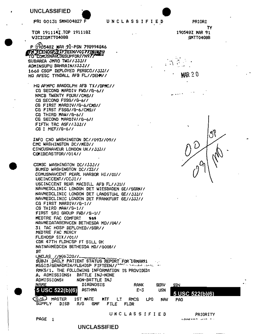 Subject = DAILY PATIENT STATUS REPORT FOR 18 MAR 91