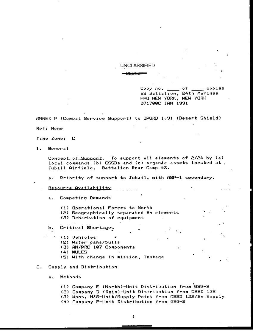 Document 6 f:/Week-35/BX600013/COMMAND CHRONOLOGY 2ND BATTALION 24TH MARINES JAN - MAR 1991 2 OF 2/annex p combat service support to opord 1 91 071:09139616141111