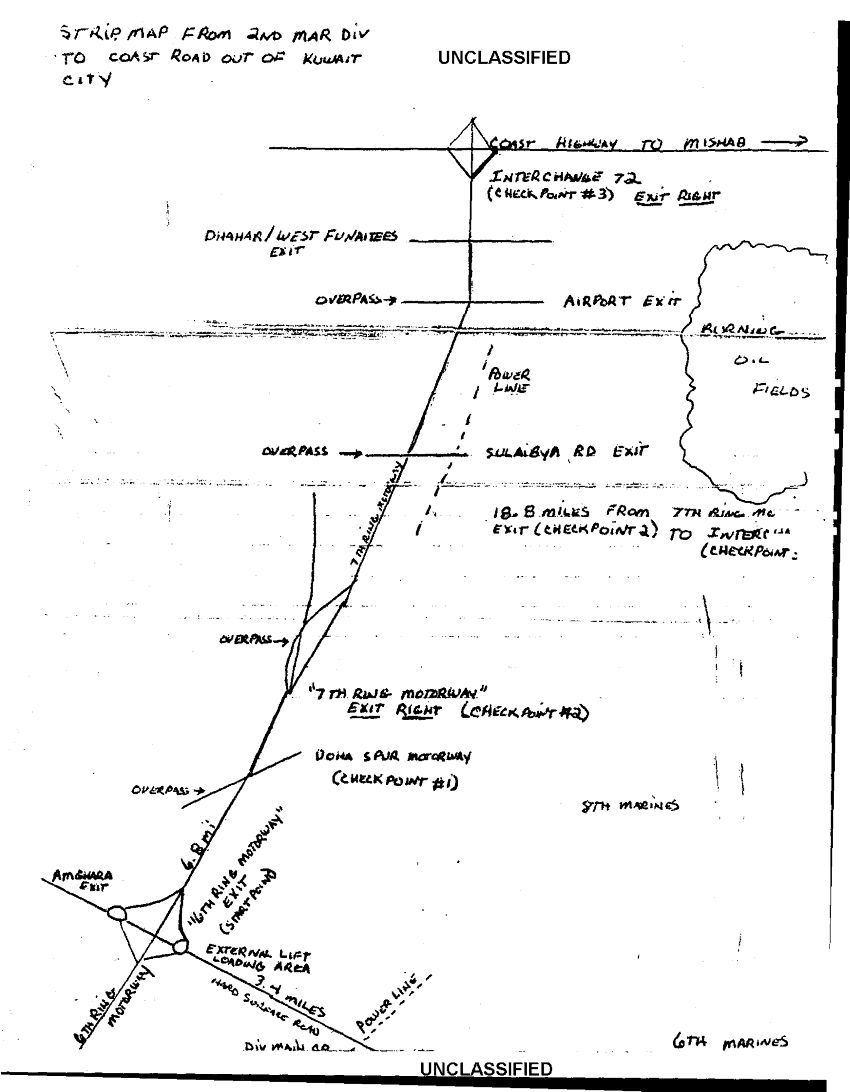 Document 1 f:/Week-35/BX600014/COMMAND CHRONOLOGY HEADQUARTERS BATTALION MAR - JUN 1991 2 OF 3/2d mardiv strip map to coast road out of kuwait :100196125359