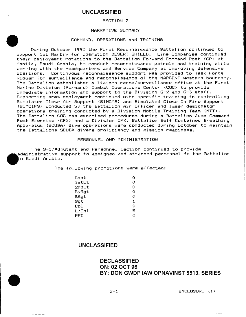 Document 3 f:/Week-38/BX600020/COMMAND CHRONOLOGY 1ST RECONNAISSANCE BATTALION OCT 1990/narrative summary command operations training:10049613404512