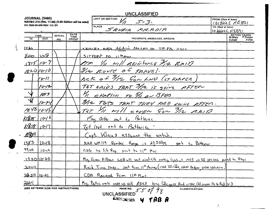 Folder Title = COMMAND CHRONOLOGY 1ST BATTALION 11TH MARINES JAN - FEB 1991