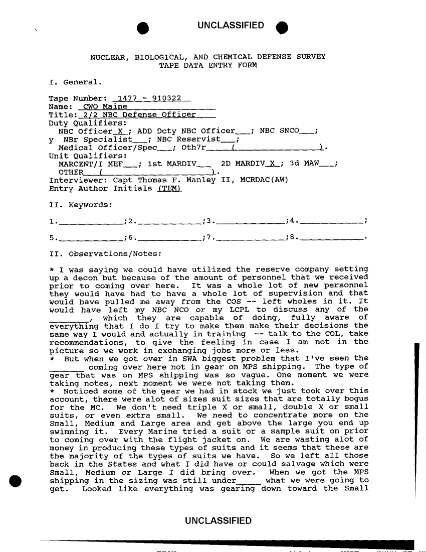 Subject = NUCLEAR BIOLOGICAL AND CHEMICAL DEFENSE SURVEY