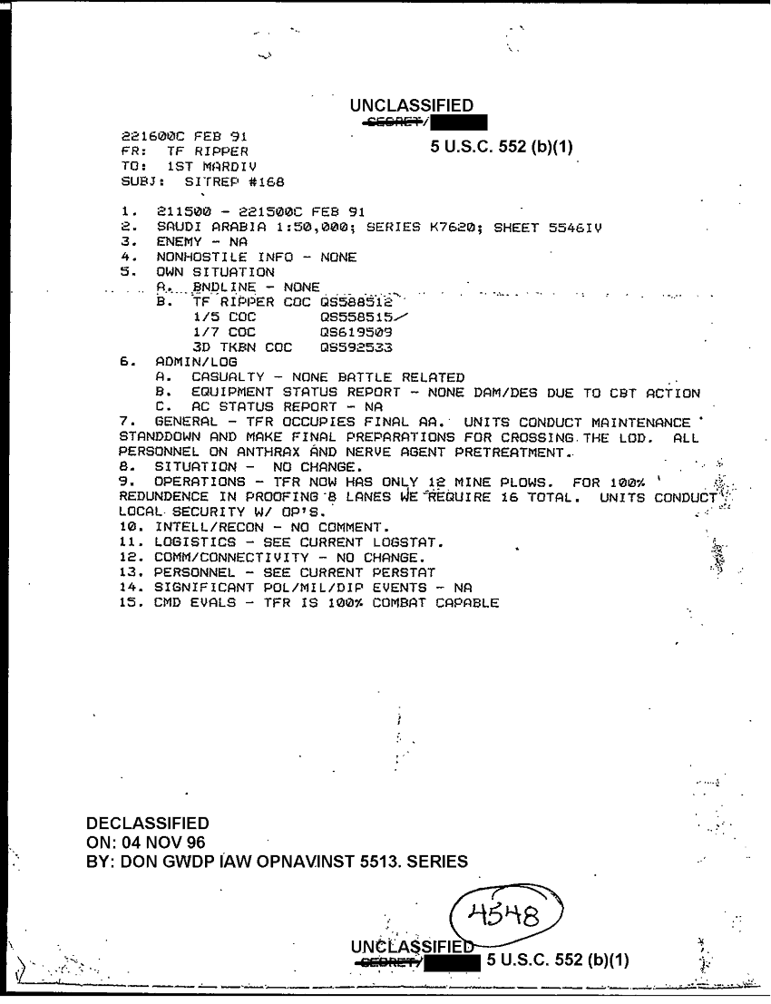Document 1 f:/Week-43/BX600056/1ST MARDIV JOURNAL ENTRIES 4510-4577 FEB 91 SEC 4 OF 4/tf ripper sitrep 168 22 feb 91:1122961652223