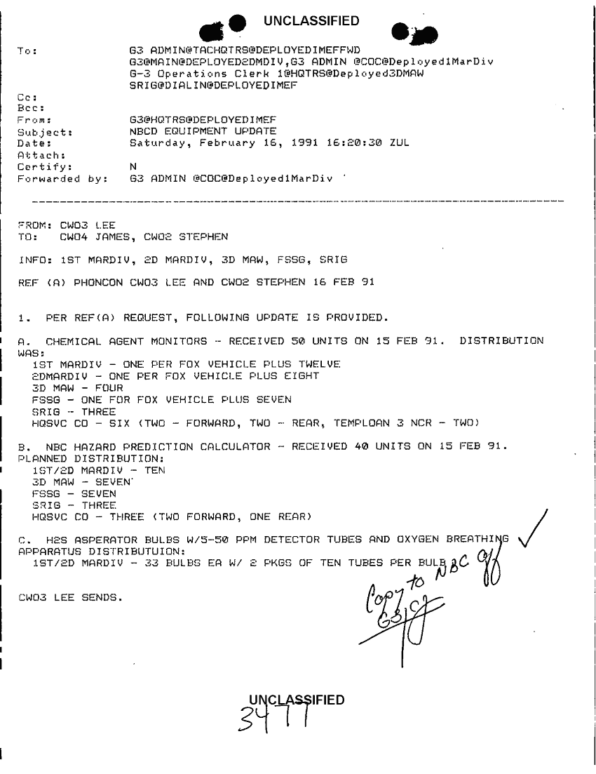Document 1 f:/Week-43/BX600056/1ST MARDIV JOURNAL ENTRIES 3282-3412 SEC 3 OF 4 FEB 91/phoncon cw03 lee and cw02 stephen 16 feb 91:1122961652234