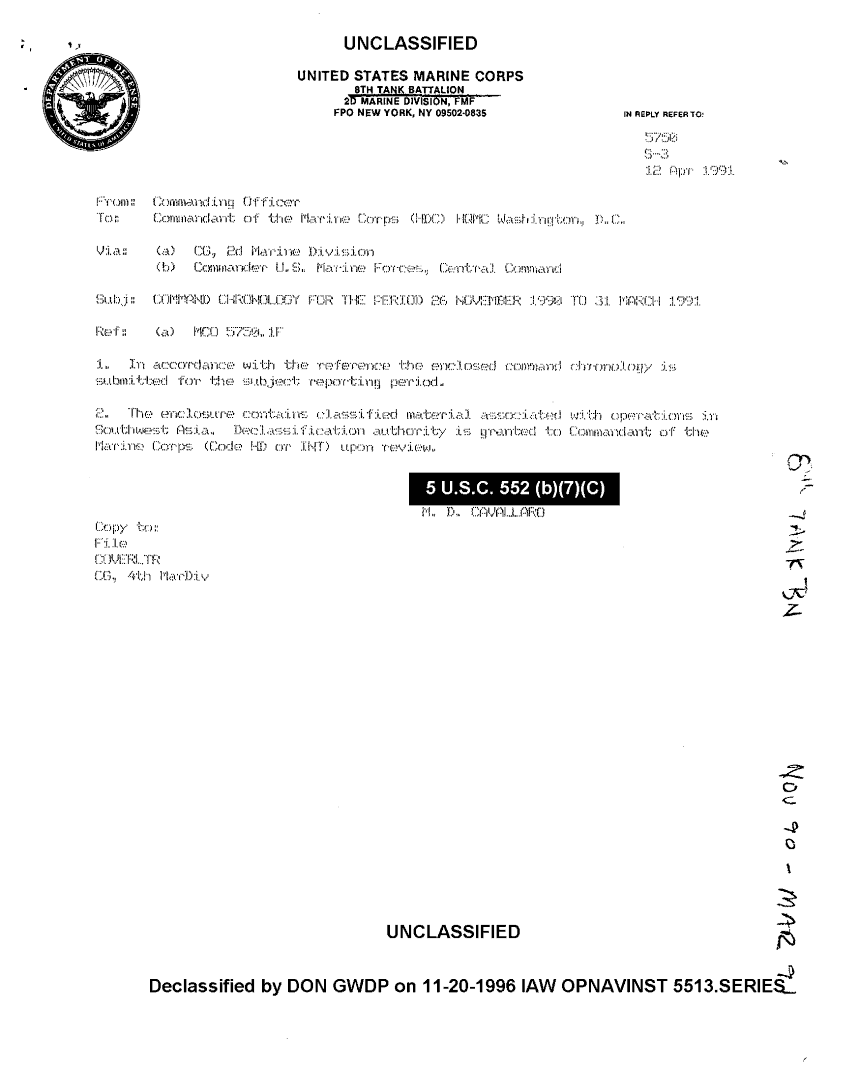 Document 60 f:/Week-34/BX600007/COMMAND CHRONOLOGY 8TH MARINES APRIL - JUNE 1990/8th tank bn command chronology nov 90 to mar 91:01029709504216