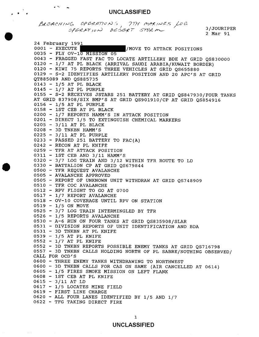 Subject = BREACHING OPERATIONS 7TH MARINES LOG 24 FEB 91