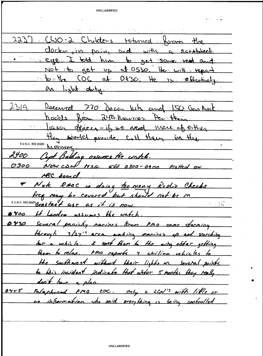 Document 103 f:/Week-35/BX600013/COMMAND CHRONOLOGY 3RD BATTALION 24TH MARINES JAN - MAR 1991 4 OF 4/handwritten log:0102970950272