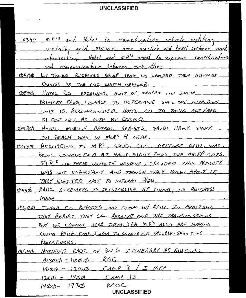 Document 103 f:/Week-35/BX600013/COMMAND CHRONOLOGY 3RD BATTALION 24TH MARINES JAN - MAR 1991 4 OF 4/handwritten log:0102970950272