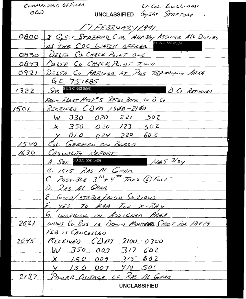 Document 103 f:/Week-35/BX600013/COMMAND CHRONOLOGY 3RD BATTALION 24TH MARINES JAN - MAR 1991 4 OF 4/handwritten log:0102970950272