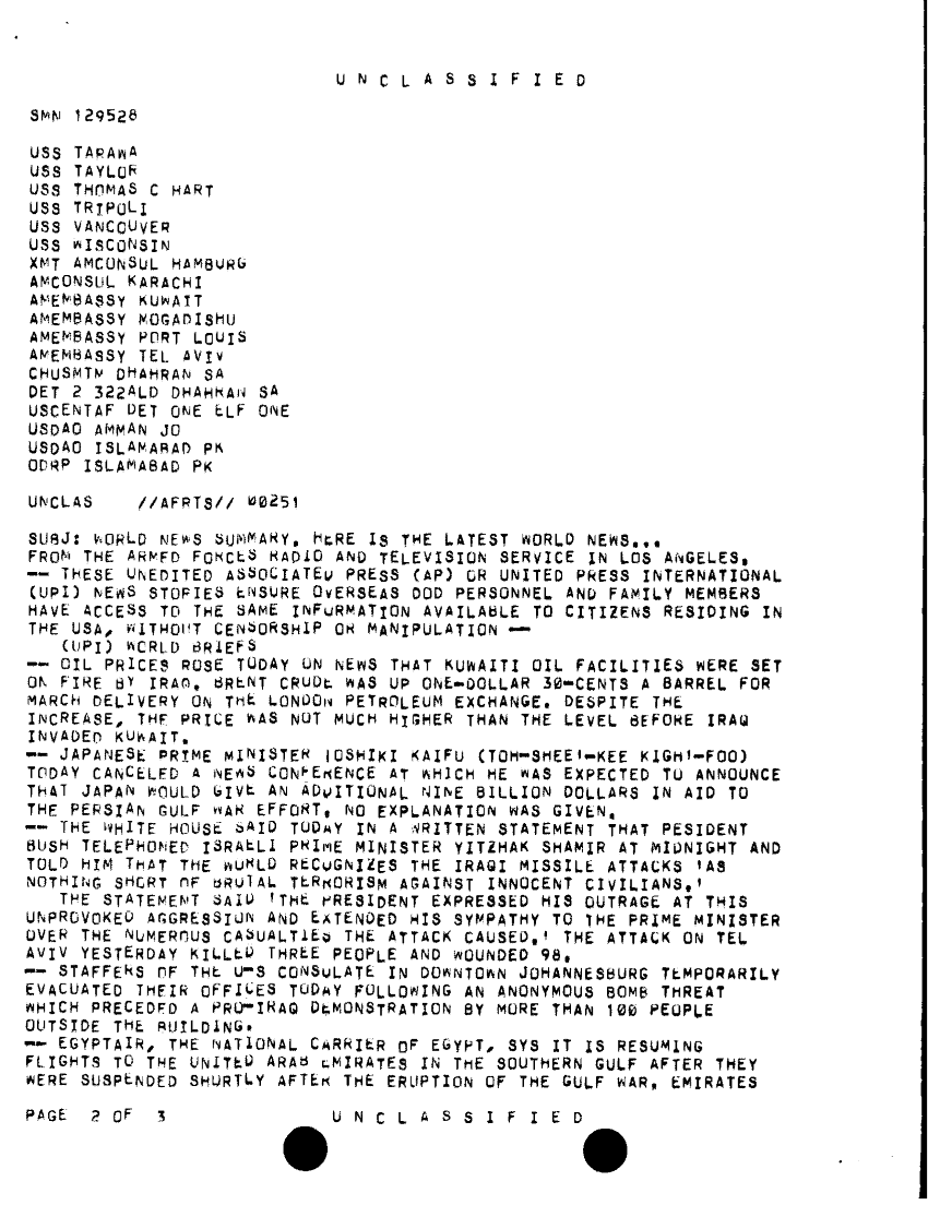Document 3 f:/Week-36/BX300047/FOLDER 2 MESSAGE FILES FOR 23 JAN 1991 CNA 2757 1OF2/world news summary 23 jan 91:1011961541432