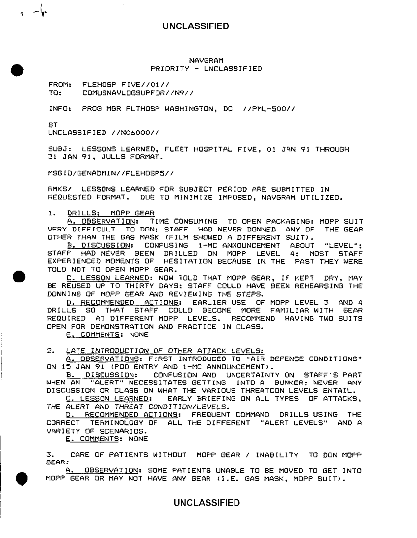 Document 20 f:/Week-36/BX300052/FLEET HOSPITAL WORKING PAPERS VARIOUS SOURCES CNA 2837/navgram lessons learned f h f 1 jan 91 to 31 jan:1018961451347