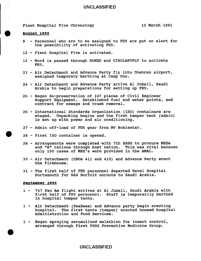 Document 19 f:/Week-36/BX300052/FLEET HOSPITAL WORKING PAPERS VARIOUS SOURCES CNA 2837/flet hospital five chronology 12 mar 91:1018961451358