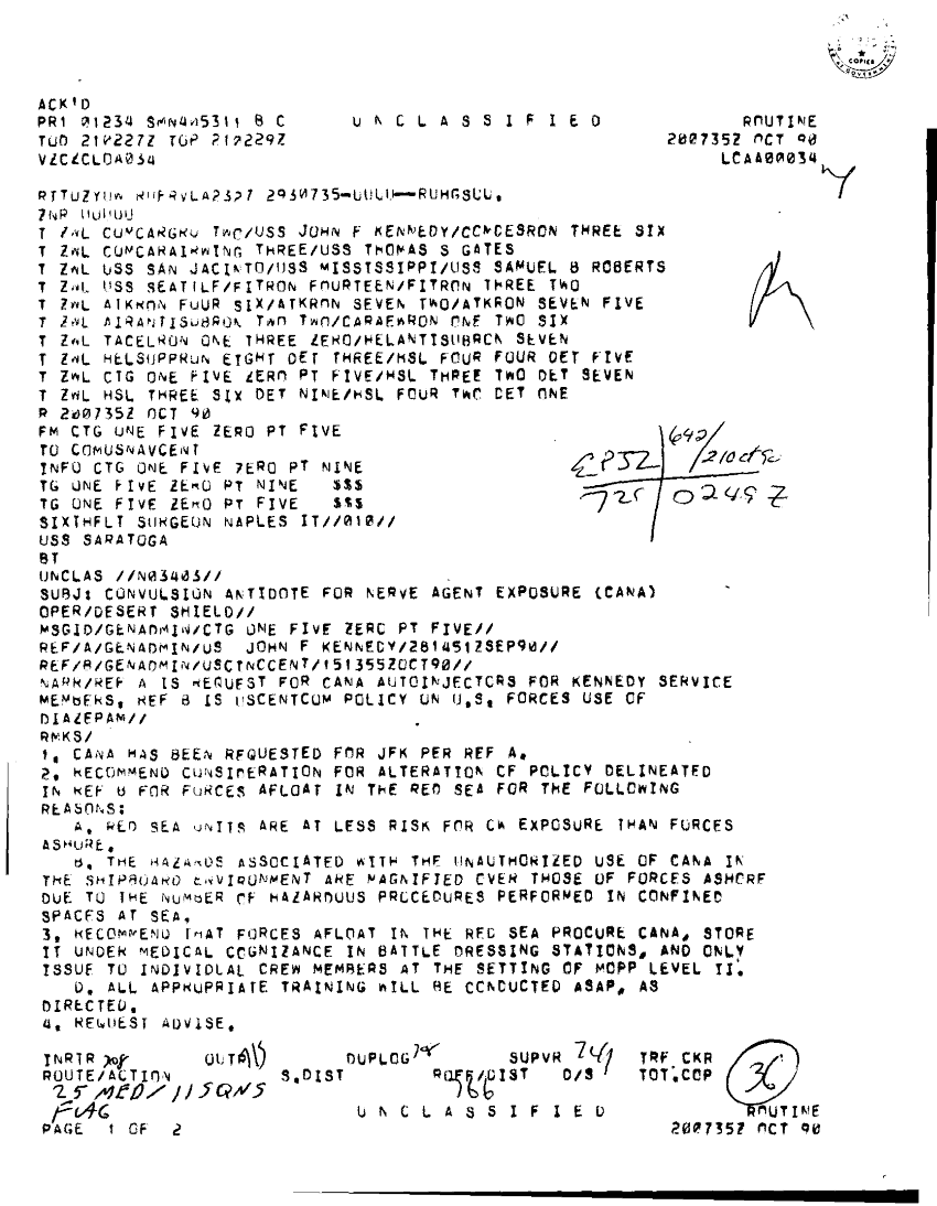 Document 1 f:/Week-41/BX300092/FOLDER 1 LOGISTICS AND MEDICAL RELATED MESSAGES SEP 90 - MAR 91 CNA 1690/convulsion antidote for nerve agent exposure:11049611394025